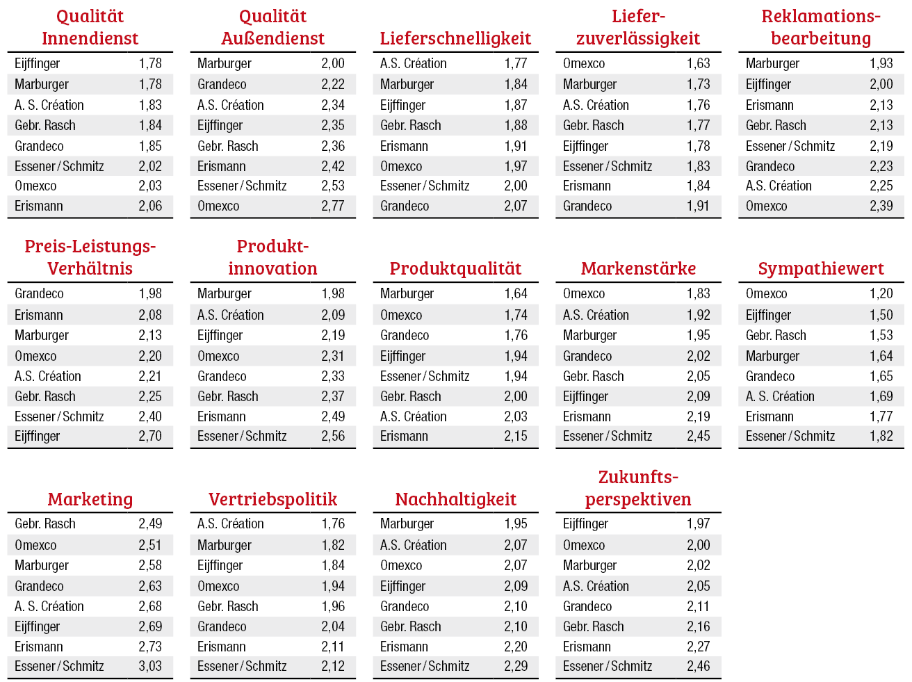 Führend in zwei Einzelkriterien ist auch der niederländische Tapetenlieferant Eijffinger, nämlich Qualität des Innendienstes und Zukunftsperspektiven. Gebr. Rasch aus Bramsche und Grandeco aus Belgien, die beide zur belgischen Unternehmensgruppe The Wallfashion House gehören, wurden für jeweils eine herausragende Leistung gelobt: Gebr. Rasch für das Marketing und Grandeco für das Preis-Leistungs-Verhältnis.